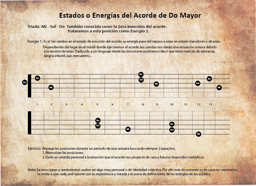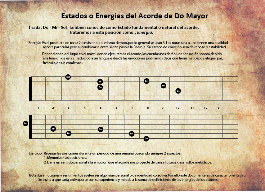 Para comenzar a tratar un acorde, en este caso el acorde de Do Mayor, lo 1ero que vamos a hacer es intentar sentirlo como una energía que este proyecta sobre nosotr@s.           Los sonidos que emiten los acordes nos producen sensaciones que conectan con nuestros sentidos y emociones personales, con nuestra memoria, con nuestras ideas.